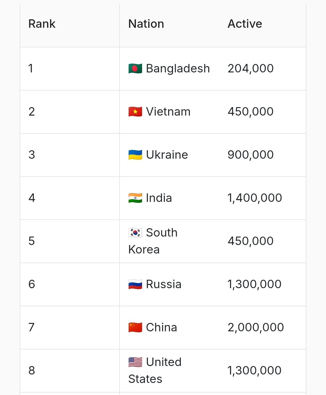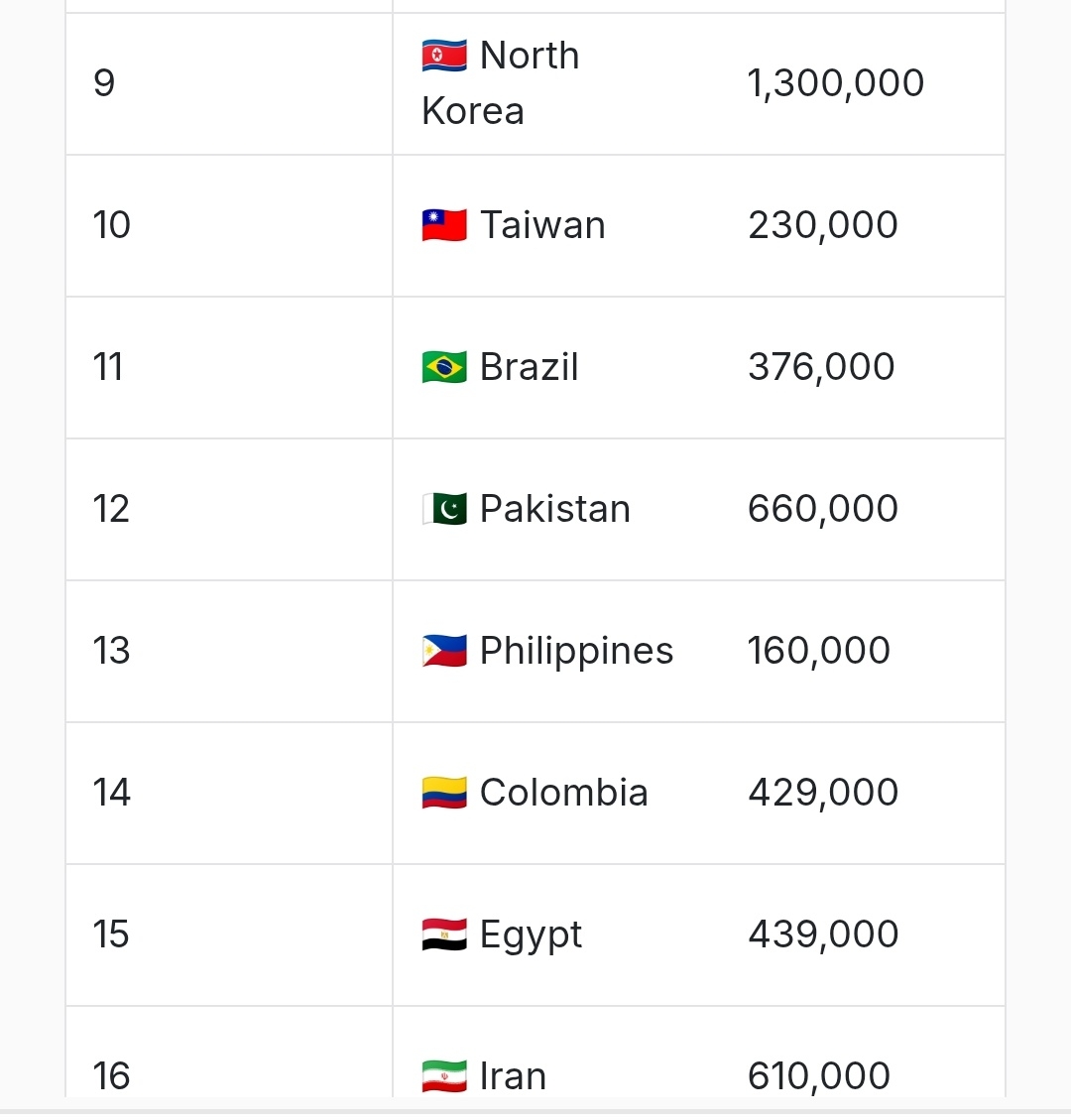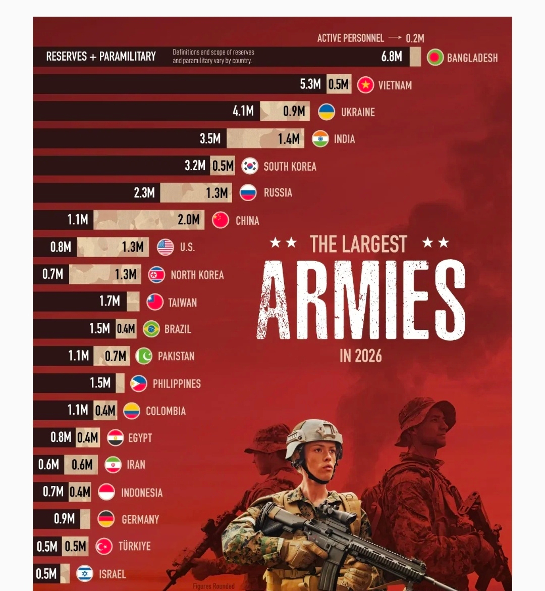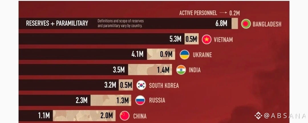 Bangladesh ranks #1 globally with over 7 million personnel, driven almost entirely by reserves and paramilitary forces.China has the largest active-duty military, with roughly 2 million troops.