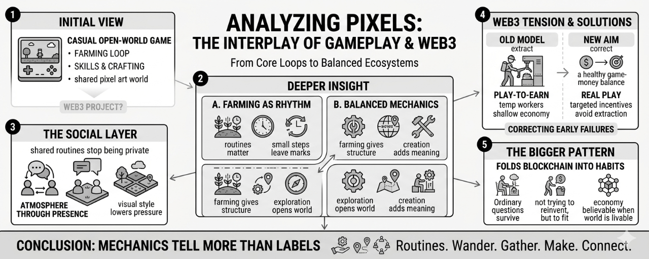 But for now, Pixels feels like one of those cases where the mechanics tell you more than the label does. People farm. They wander. They gather. They make things. They bump into each other. They settle into routines. And somewhere inside those routines, the bigger idea is still there, but quieter than you expect. Just enough to notice, not enough to settle the whole thing.