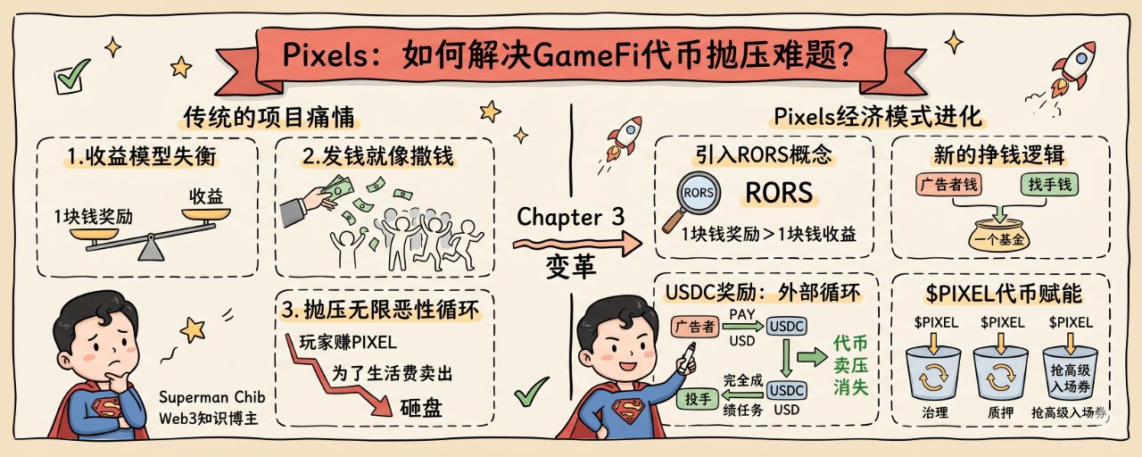 这就不得不提到那个 RORS,说白了就是:我发出去 1 块钱奖励,能不能换回 1 块钱以上的收益。以前的项目发钱就像撒钱,撒完人就散。但 Pixels 现在的逻辑是:我让你挣钱,但我必须得能从广告商或者你氪金的钱里赚回来。你看它现在的 Chapter 3 搞公会竞争,本质上还是为了让代币经济循环起来,而不是让你领完低保就撤。