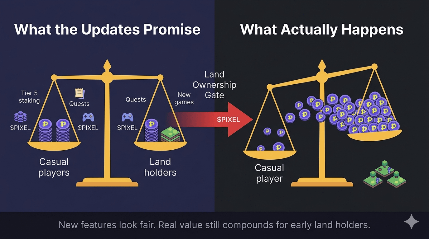 Here’s the part that bothers me. The team keeps shipping these polished layers—new pets, new industries, staking that feels generous on paper—and the community cheers like the moat is finally gone. I caught myself yesterday afternoon, sitting there with my basic stall, grinding the free quests like I used to, and realizing my hourly PIXEL output hadn’t moved much at all while land holders were suddenly posting screenshots of 3x rewards and rare drops. It doesn’t feel malicious. It feels… inevitable. Like the updates are optimizing for retention of the early money rather than onboarding the next wave.