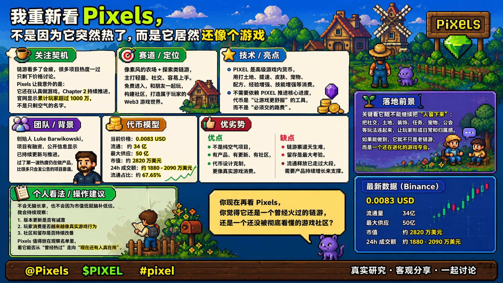 说实话,我最近重新盯上 Pixels,不是因为我突然对链游又有信仰了。恰恰相反,是因为这个赛道看多了以后,人会有点疲。太多项目刚出来的时候都讲得特别大,什么下一代游戏范式,什么资产真正归玩家,什么边玩边赚的未来,结果热度一过,玩法没人聊了,社区也散了,只剩下一堆人在那里讨论代币还有没有反弹。我对这一套已经有点条件反射了。所以这次重新回头看 Pixels,我最先感受到的不是兴奋,而是意外。它居然还在认真做游戏,而且还没有把自己彻底做成一个只剩交易讨论的名字。