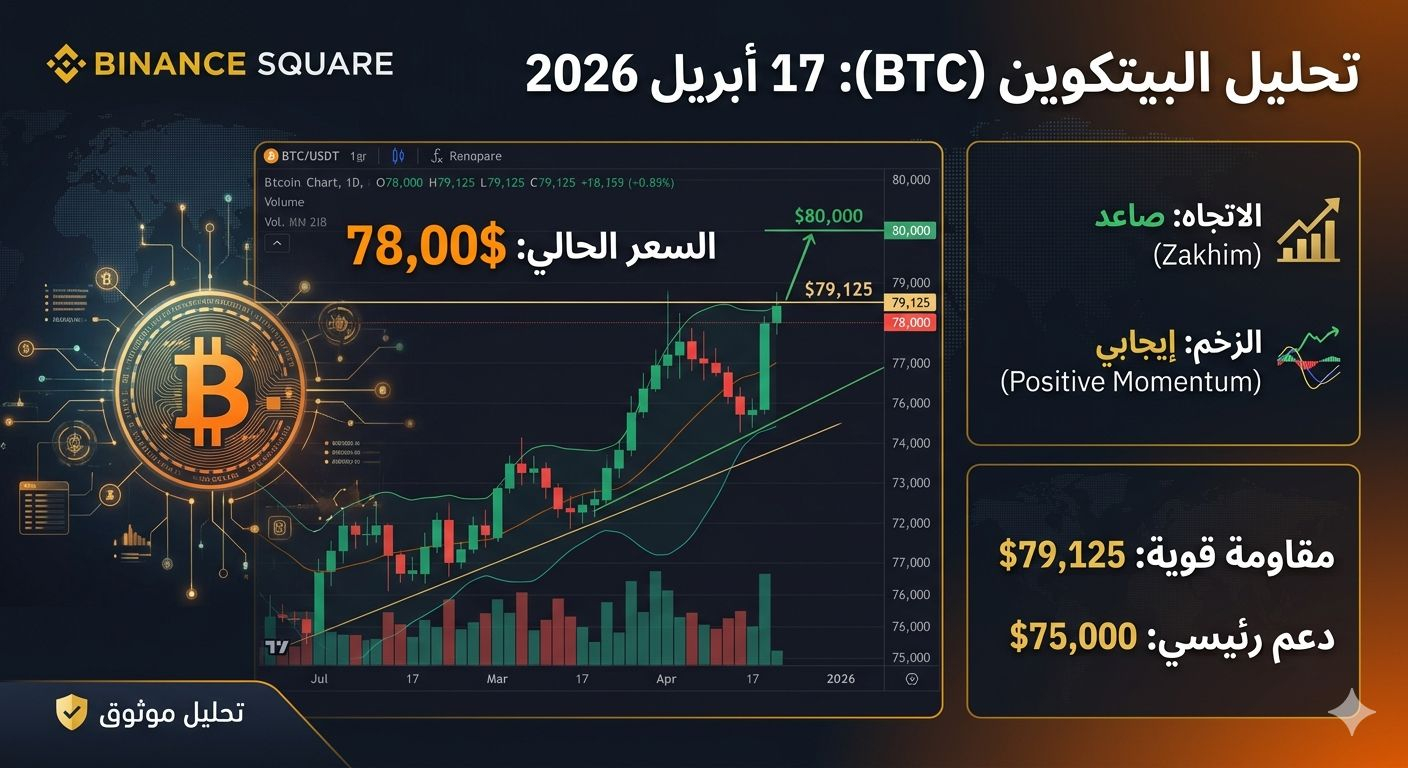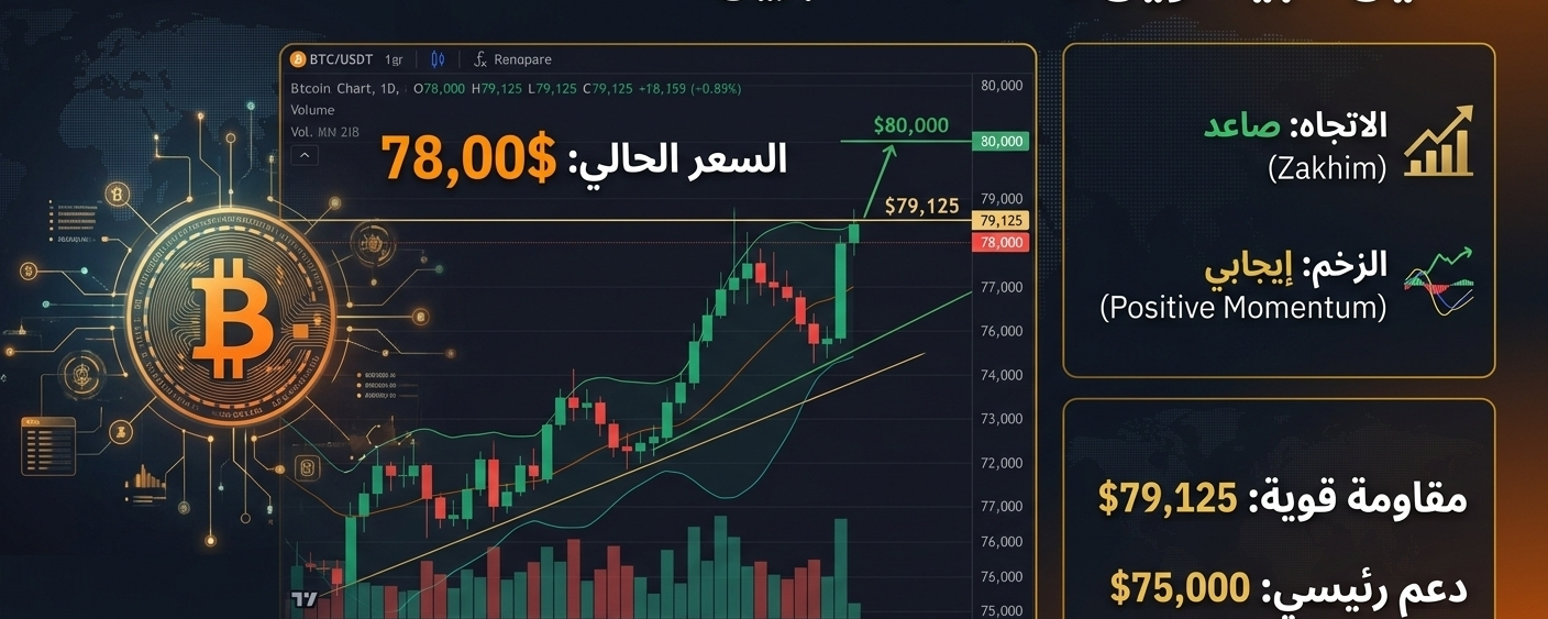مناطق المقاومة: يواجه السعر الآن مقاومة شرسة عند 79,125$. اختراق هذا المستوى بشمعة يومية سيفتح الباب مباشرة نحو الهدف النفسي القادم عند 80,000$ وربما 85,000$.