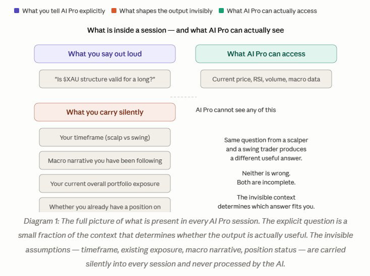 You bring assumptions into the session that you never state out loud. Not because you are hiding them. Because they feel so obvious to you that articulating them would seem unnecessary. You know what timeframe you are trading. You know your risk tolerance. You know what macro narrative you have been following for the past two weeks. That context is so present for you that it barely feels like context. It feels like reality.