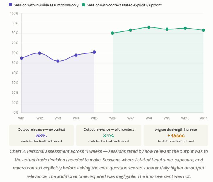I started testing what happened when I made the invisible visible. Before asking anything about the setup, I would open the session with one sentence of context: I am trading short-term, I am currently flat, I have been watching the dollar weaken this week, and my risk on this trade is limited to X.