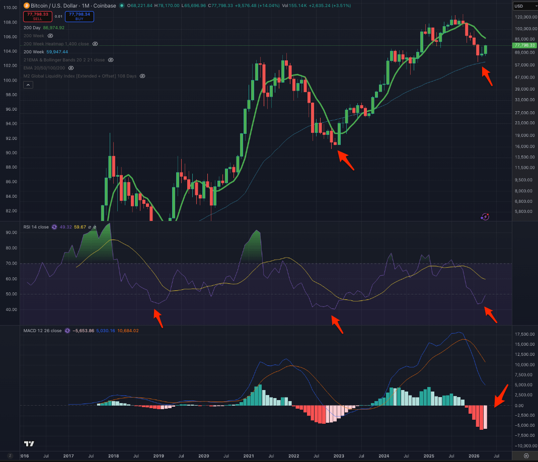 RSI is turning upward, similar to levels seen at prior bear market bottoms
