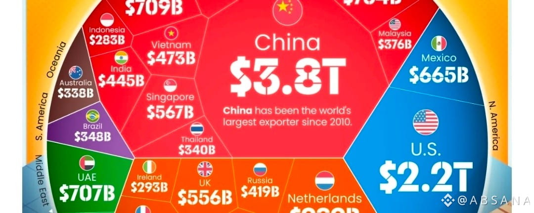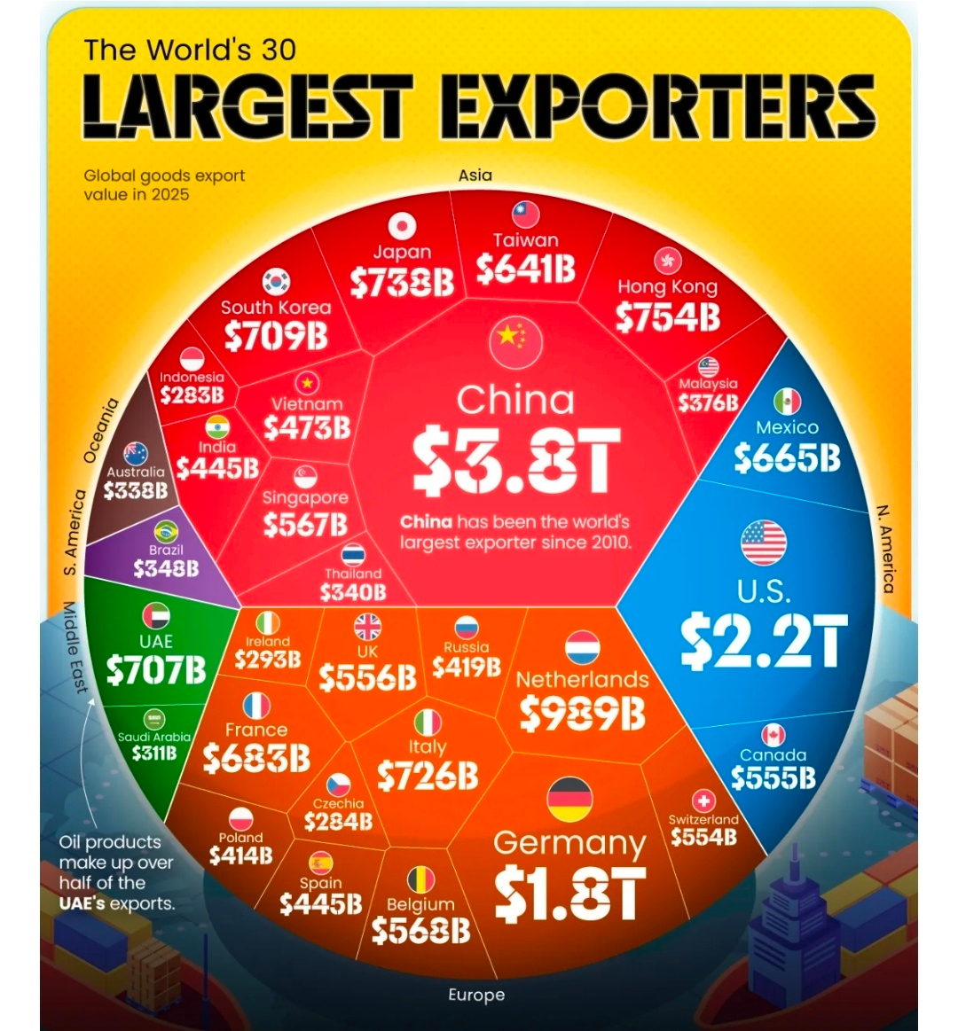 China’s $3.8 trillion in exports is nearly double that of the United States, underscoring the scale of its dominance in global manufacturing and trade.