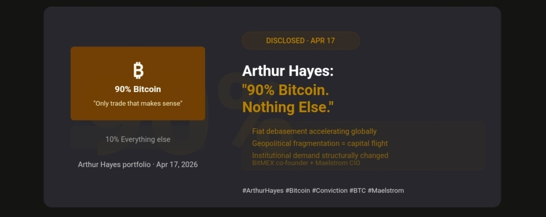 Yesterday, as Bitcoin was breaking out past $77,000, Arthur Hayes — co-founder of BitMEX and CIO of Maelstrom — disclosed publicly that his personal portfolio is currently 90% Bitcoin.