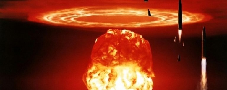 Look at this powerful image: Nuclear explosions lighting up the sky, missiles launching, military vehicles on standby — a scene that changed history.
