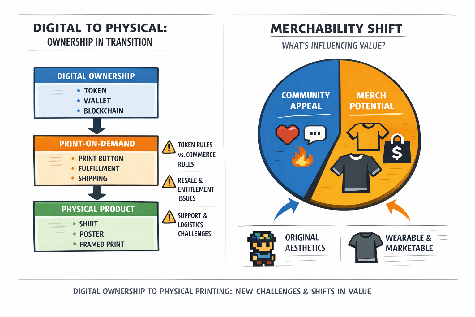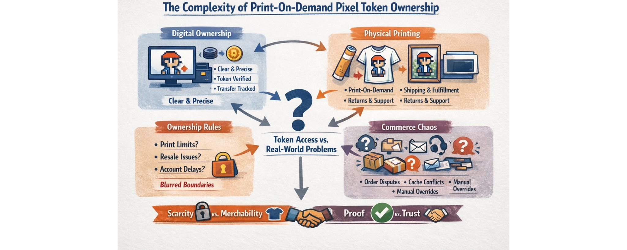 And pixel art makes this stranger, not simpler. Because the value is not only in scarcity. It is in recognizability. A pixel image travels well onto physical goods precisely because it is visually compact, almost logo-like in some cases, easy to reproduce, easy to want. So when print-on-demand gets attached to pixel tokens, the token starts behaving less like static ownership and more like a conditional license surface. Maybe personal display. Maybe collectible merch access. Maybe something closer to commercial leverage, depending on how the rights are written, or not written, which is often the real issue.