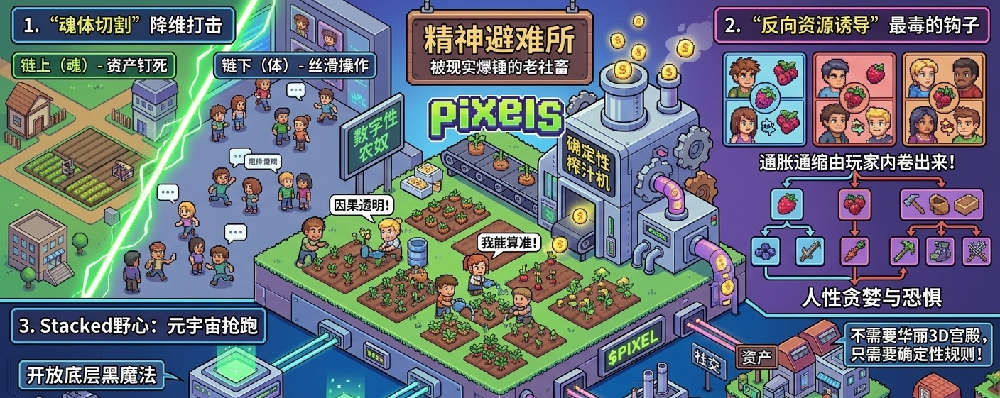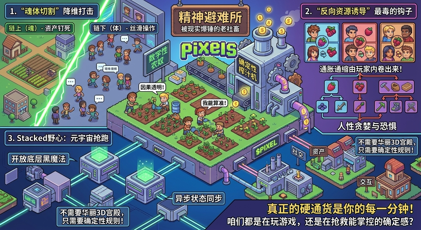 最近刷了几天@Pixels 这像素农场,老子脑子里嗡的一声就炸了:这他妈哪是游戏,根本就是一台冰冷高效的确定性榨汁机。它不靠任何光污染特效,就靠一堆死板的像素格子,24小时不间断地给你泵出那种“老子终于能算准明天收益”的稀缺安慰剂。