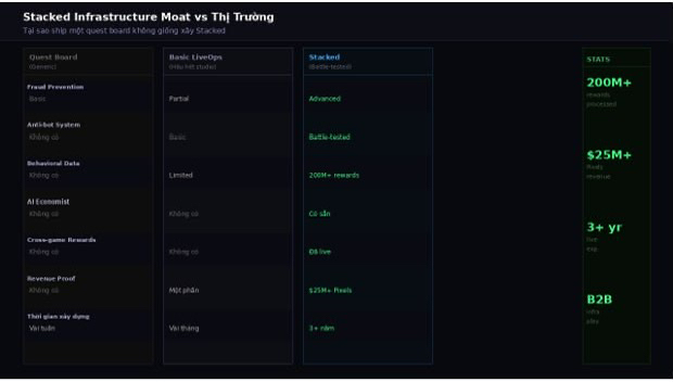 Trên cùng của cái nền đó, Stacked layer thêm một AI game economist. Không phải chatbot. Là một tool để studios hỏi những câu hỏi thật về player behavior, tại sao một cohort cụ thể đang churn, reward budget đang leak ở đâu, và experiment nào đáng chạy tiếp theo. Câu trả lời không chỉ là insight mà là actionable trong cùng một hệ thống.
