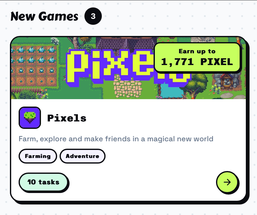 Right now the games connected to Stacked are Pixels, Pixel Dungeons, Sleepagotchi and Chubkins, four different games, all sharing the same rewards system, all living inside one ecosystem, the more games that join, the bigger the network gets and the more ways players have to earn.