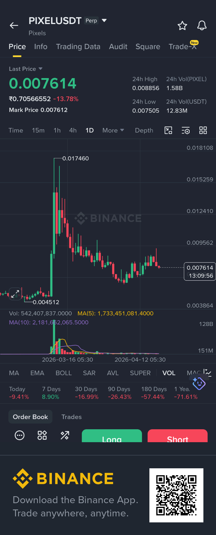 The chart for PIXEL/USDT shows a classic consolidation phase, but don't let the "red" today fool you. While the current price sits at 0.007614 (down roughly 13%), the underlying fundamentals of the Pixels ecosystem tell a much more resilient story.