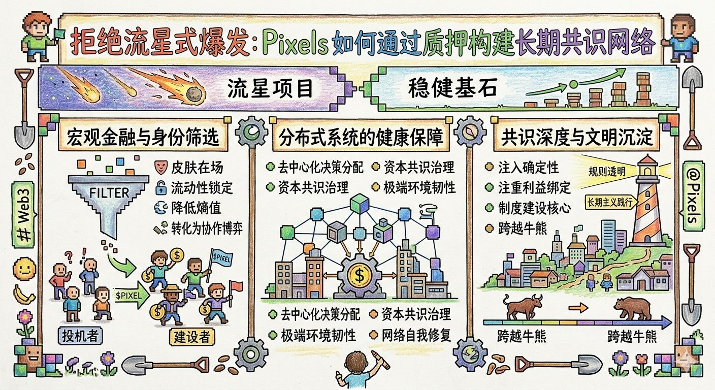 在Web3这个日新月异的实验场里,我们见证了太多如同流星般划过的短期项目,它们往往在狂欢中爆发,又在流动性枯竭的瞬间归于死亡。这种周而复始的周期性活跃,迫使我们必须站在更高的维度去思考:一个数字生态究竟靠什么来抵御市场的无序波动?当我重新审视 @Pixels 的质押生态时,我看到的不再是简单的年化收益率,而是一套严谨的、关于数字社会治理与资本效率的底层逻辑。