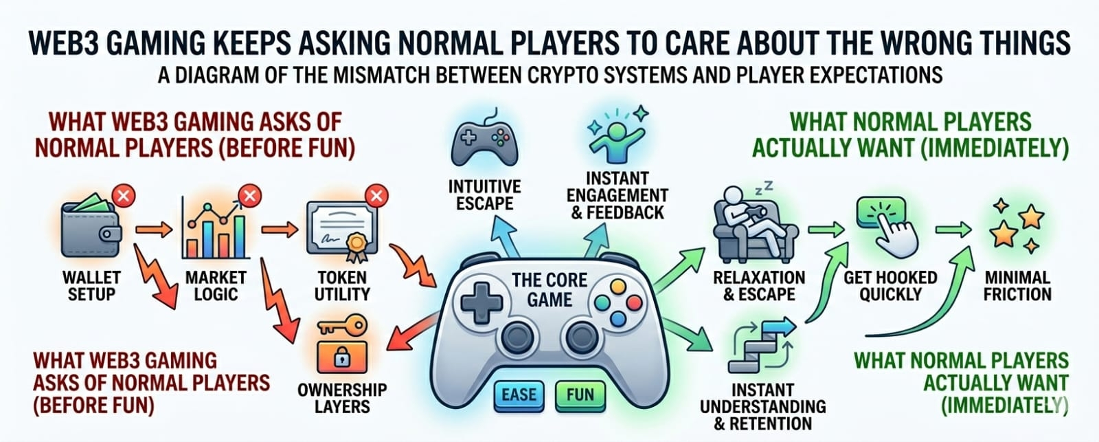 It keeps asking them to care about stuff that should stay in the background. Wallet setup. token utility. ownership layers. market logic. on-chain identity. community governance. Most normal players do not wake up wanting any of that. They want the game to feel good fast. That is it. They want the first few minutes to make sense. They want to know what they are doing and why they should keep going. If the game earns their attention, then maybe they will learn the extra systems later. But Web3 games keep flipping the order. They dump the baggage up front and act surprised when people leave.