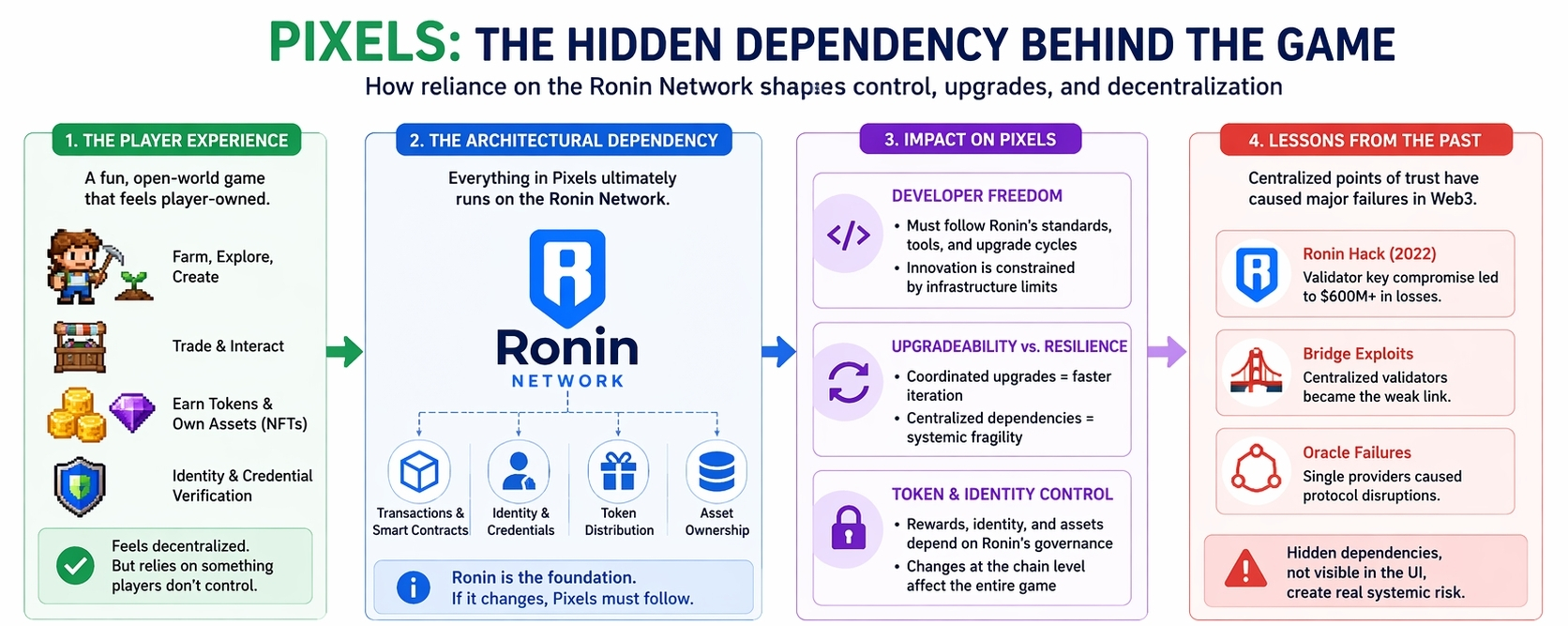 And that’s where things start to feel fragile. Because history has already shown what happens when these foundations crack. The Ronin Network hack wasn’t just a technical failure, it was a reminder that even systems designed for decentralization can hinge on very centralized points of trust. When those points fail, everything built on top feels it instantly. In a game like Pixels, that doesn’t just mean downtime—it means the economy, the rewards, the sense of ownership itself can be shaken.