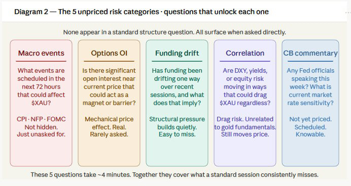 After that session I started cataloging the specific risk categories that a broad structure question consistently fails to surface. The list was longer than I expected. Scheduled macro events in the next 48 to 72 hours. Options market positioning — specifically whether there was significant open interest at nearby strikes that might act as a magnet or barrier for $Xau price. Funding rate direction and whether it had been drifting in a way that created structural pressure on one side. Correlation with other assets that might be moving for reasons unrelated to gold's own fundamentals but could drag price anyway. Central bank commentary scheduled for the week that had not yet been priced in.