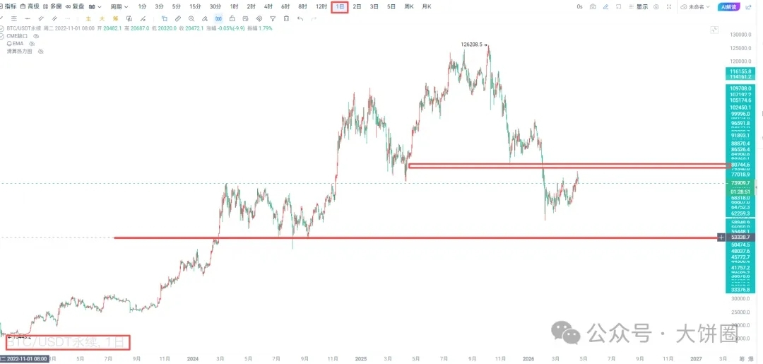 BTC价格在昨日试探74700支撑后短暂反弹至76200,于晚间开始持续下跌行情,最低下探73700,目前价格74000附近,近下方73588支撑暂时有效,但是反弹势能较弱,还需观望晚间美股开盘后资金情况,中长线需重点关注下方70000整数关口,跌破70000后我的长线空单会做成本防守,日内短线多单关注73588/71888,空单的话暂时关注昨日74700/76188两个位置,个人建议高空为主,如有上方空单的,可以考虑在下方支撑位置选择多单进场以对冲空单的不减仓格局,近期个人操作确实偏重空头。