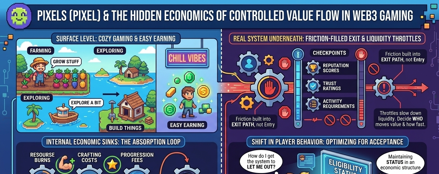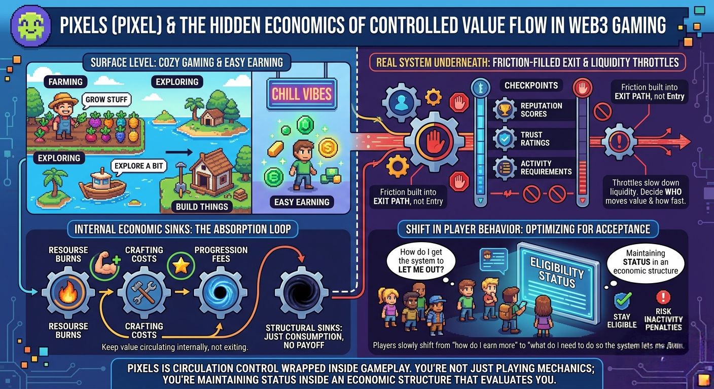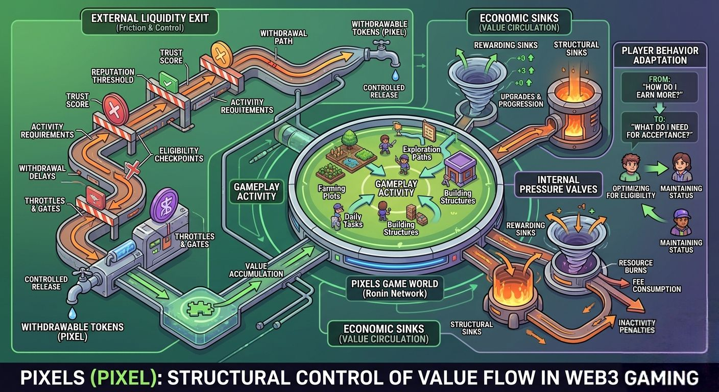 Here’s the thing—if every bit of in-game value could instantly flow out into external liquidity, the whole system would fall apart. Fast. So Pixels (like most Web3 economies that want to survive more than a minute) builds friction into the exit path.