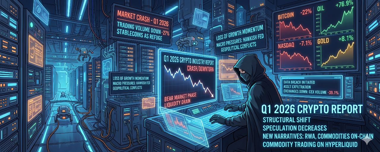 2026年第一季度,加密市场并没有迎来反弹,反而在2025年底的下行趋势中进一步恶化,逐渐进入一个更明确的“熊市阶段”。在宏观环境收紧与地缘政治冲突的双重影响下,整个行业呈现出明显的收缩与重构特征。