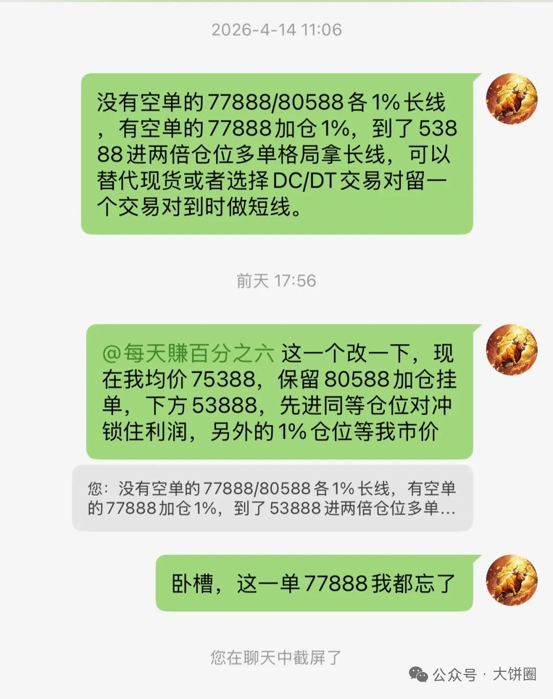 现在是2026.04.21早晨05:56分,这次使用手机发表,长话短说。目前持有75388空单再次被套,上方80388加仓,加仓后均价77888减仓。在70588挂了一个短多。