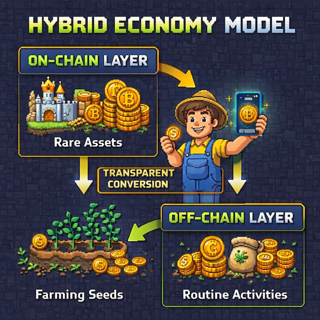 The practical answer to why is performance and cost. On-chain transactions cost gas fees and take time to confirm. For a game that wants players clicking, farming, and spending frequently, requiring a wallet confirmation every time someone buys seeds or completes a small trade creates friction that kills the gameplay loop. Off-chain coins let players transact instantly without fees, which makes the game feel more like a game and less like a financial application. That's a legitimate problem being solved by a legitimate solution.