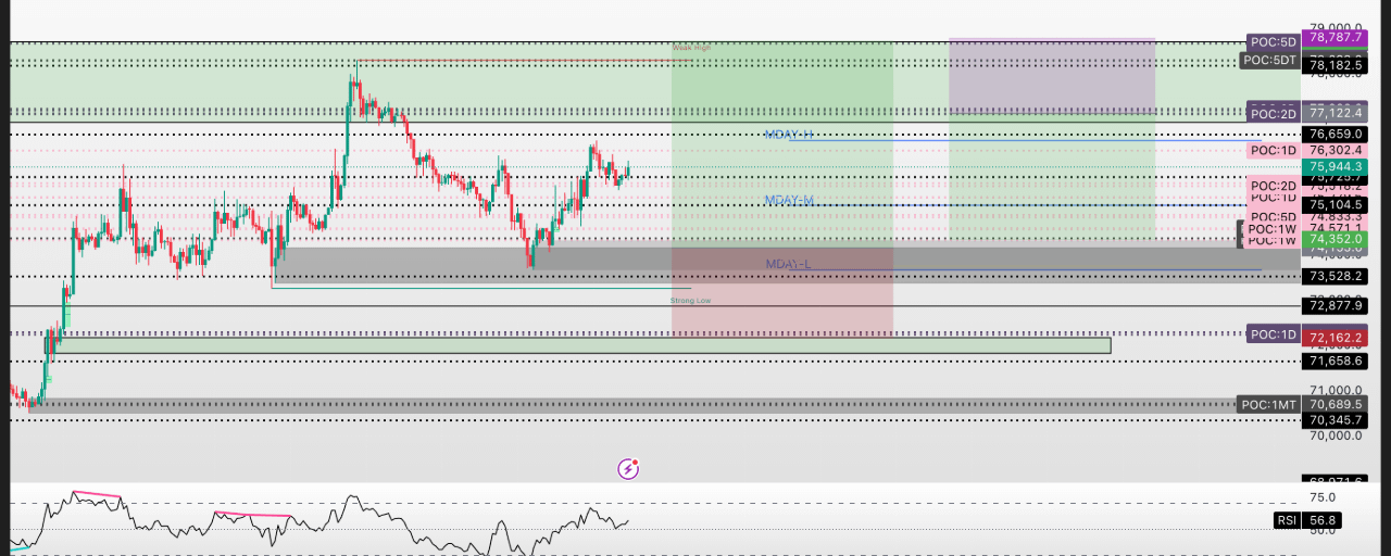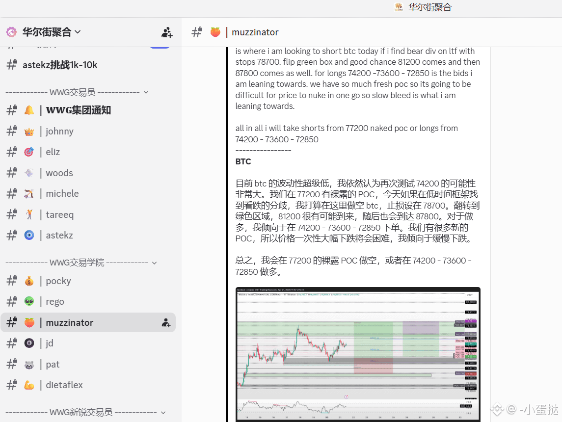 核心逻辑: 详细拆解 muzzinator 的思路。目前 BTC 在高位横盘,但 77200 存在一个“裸露的 POC”(Point of Control)。如果低时间框架出现背离,这里就是绝佳的埋伏做空点。