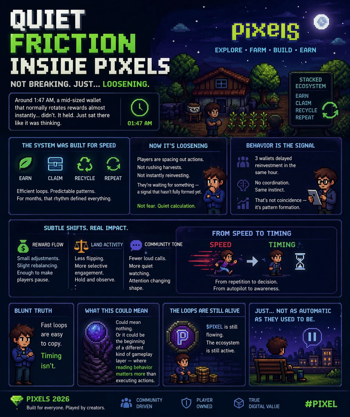 Inside @Pixels , the surface still looks activecrops moving, land trading, routines intact. But underneath, behavior is bending in subtle ways. And behavior, not announcements, is where real shifts start.