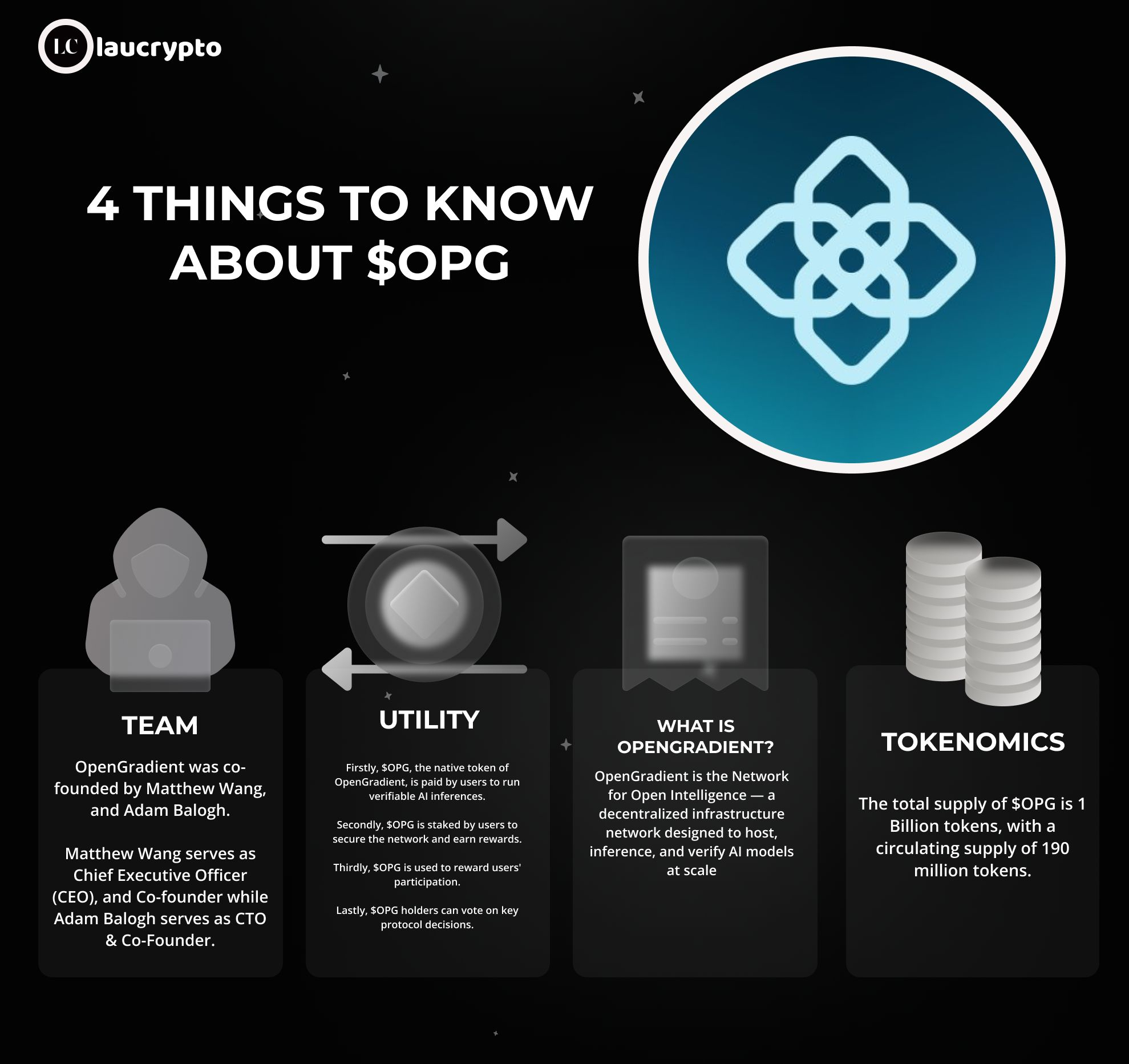 $OPG é o token nativo do OpenGradient, uma rede de infraestrutura descentralizada projetada para hospedar modelos de IA de código aberto, executar inferências de IA seguras e implantar agentes de IA na blockchain com provas criptográficas.