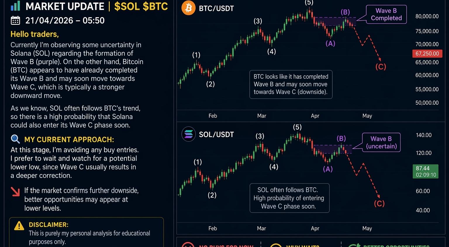 Currently I’m observing some uncertainty in Solana ($SOL ) regarding the formation of Wave B (purple). On the other hand, Bitcoin ($BTC ) appears to have already completed its Wave B and may soon move towards Wave C, which is typically a stronger downward move.