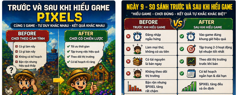 Ngày thứ 9 chơi Pixels, mình nhìn lại quá trình của bản thân và nhận ra sự khác biệt rất lớn giữa “trước khi hiểu game” và “sau khi hiểu game”.