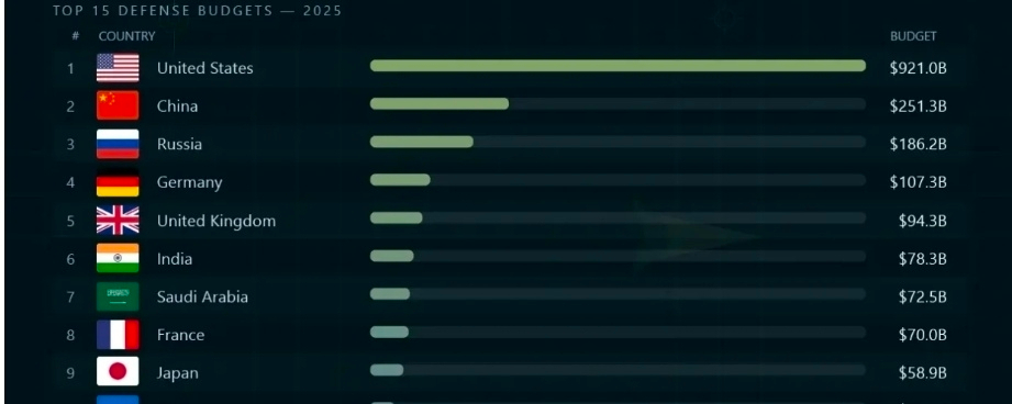 The United States remains the world’s biggest military spender with $921 billion. The country’s defense budget is larger than the next fourteen countries combined. That means the US leads all nations in military spending by country, outspending China, Russia, Germany, the UK, India, Saudi Arabia, France, Japan, Ukraine, South Korea, Italy, Israel, Australia, and Poland — all at once.