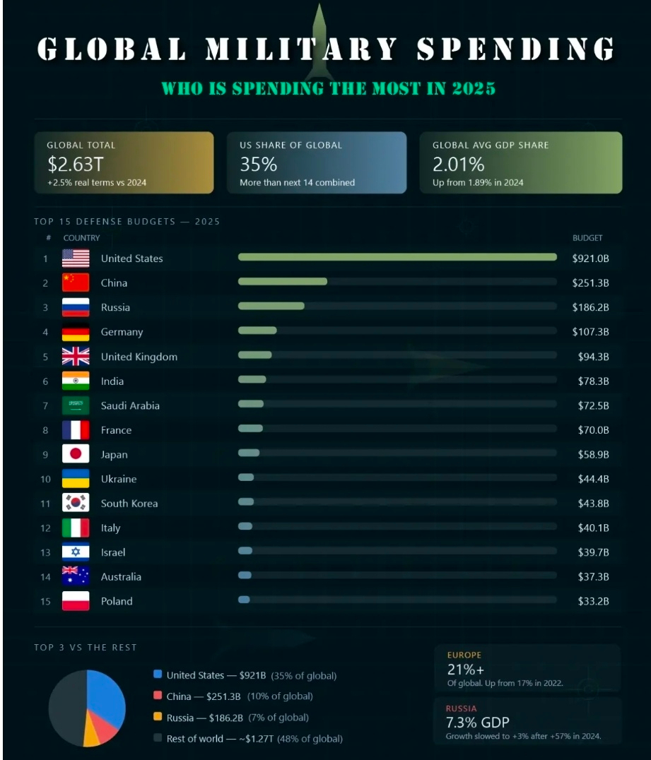 The United States, China, and Russia accounts for a huge chunk of the global total military spending by country. The US alone spent $921 billion on defense in 2025. Similarly China spent $251 billion, and Russia spent $186.2 billion. Together, these three countries spent over $1.35 trillion — more than half of everything the entire world spent on defense.