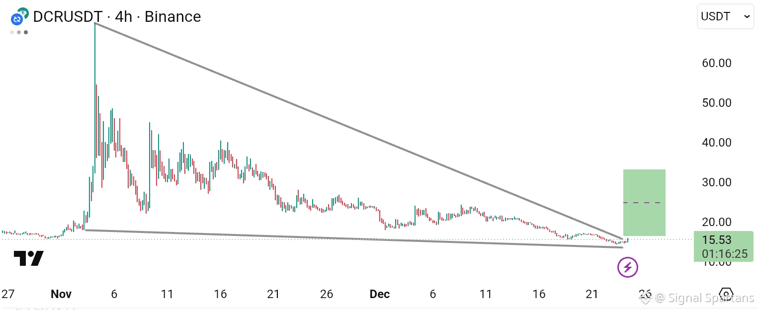 $DCR is grinding inside a long descending wedge 📉➡️📈, with price compressing right above the demand base — classic exhaustion structure after a heavy sell-off.
