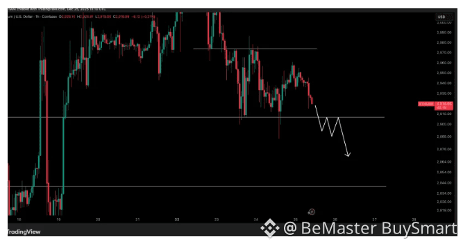 ✨ The chart shows recent price swings hitting resistance around $2,960 to $2,970 before pulling back steadily toward the lower boundary. A horizontal support line sits near $2,900, marking an area where price has bounced before. The projection shows a potential brief pause at this level before breaking lower, indicated by a white zigzag and downward arrow.