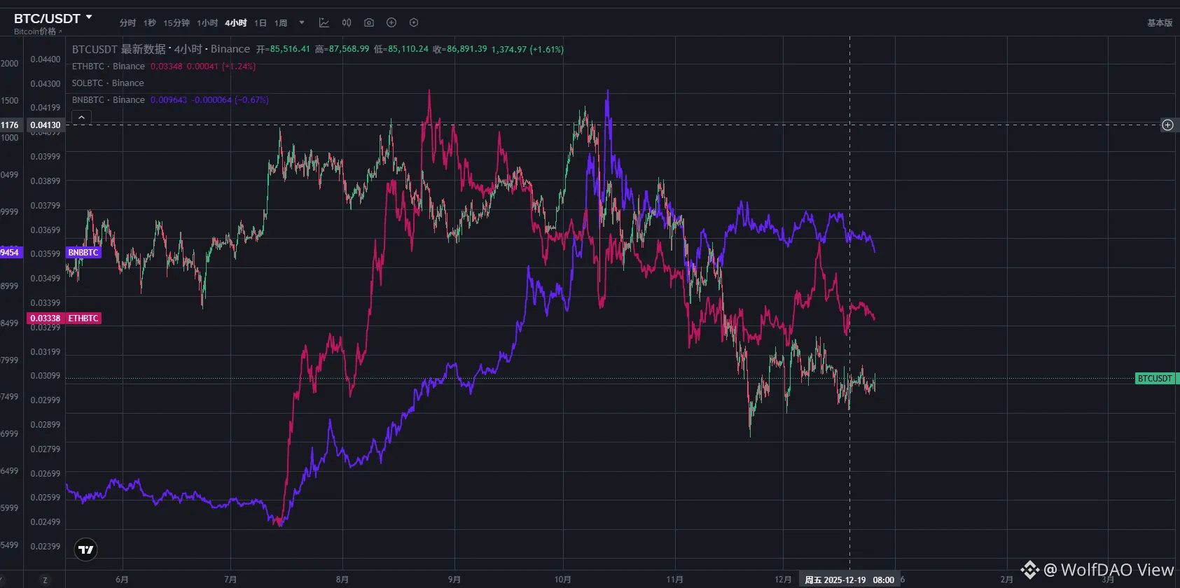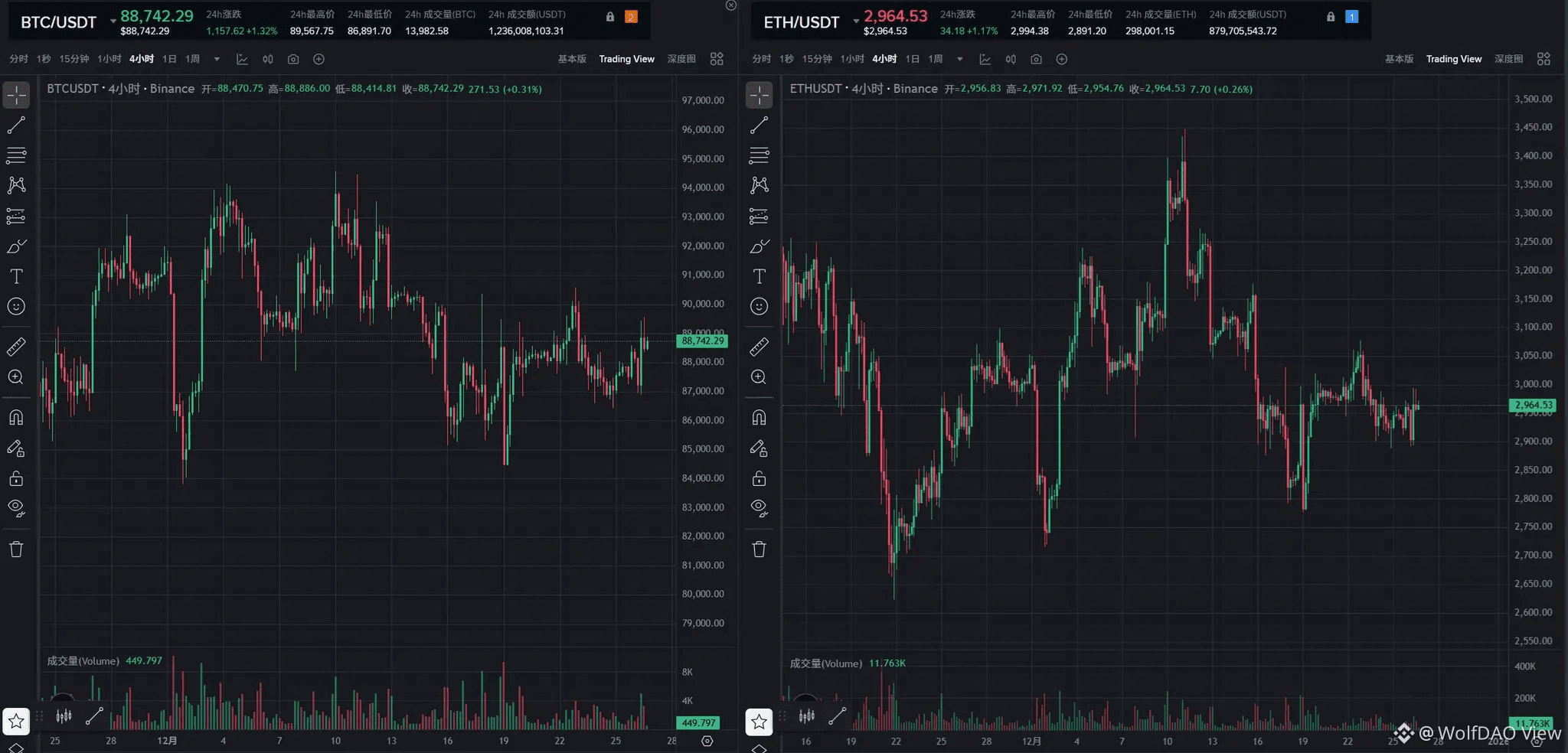 上周市场呈下跌态势,我们此前强调的 85000 美元技术支撑位表现有效。上周五 BTC 最低触及 84500 美元后,本周开启反弹走势。从日线与周线级别来看,前期持续下跌后,85000 美元支撑力度得到验证,周末市场维持反弹节奏,整体呈现震荡回升格局。