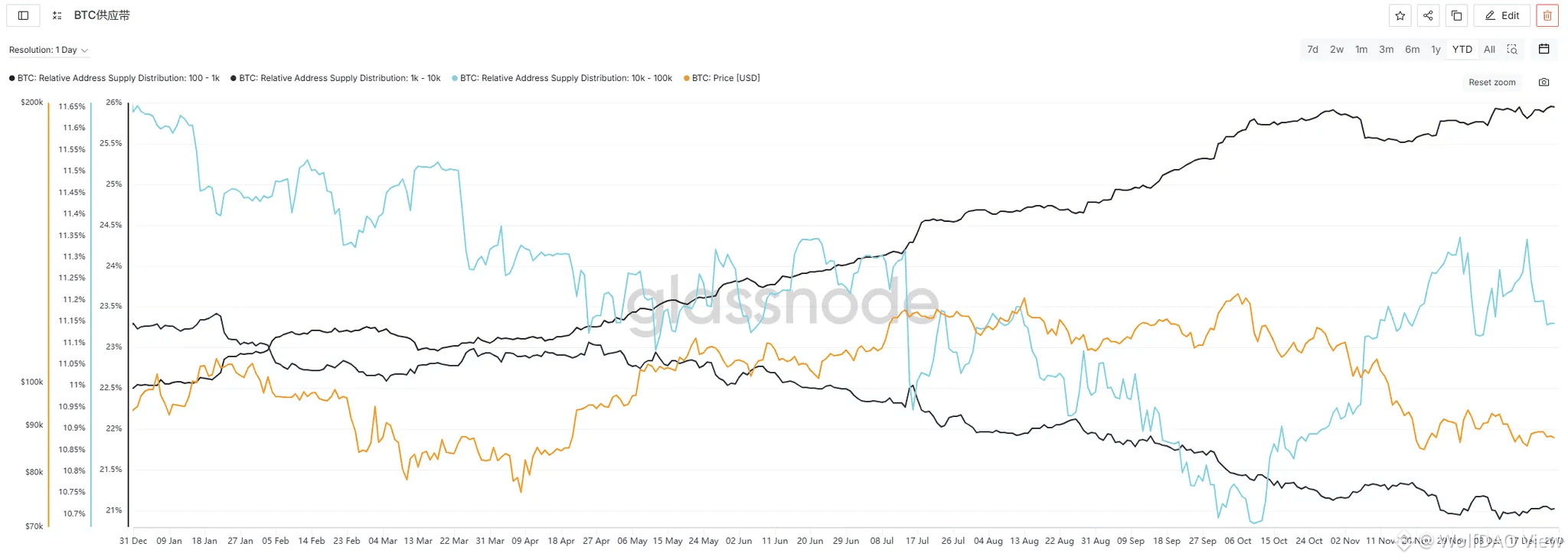 从比特币持币地址占比来看,本周 100-1K BTC 区间的持币地址占比从 25.813% 升至 25.951%,呈现小幅增持迹象;10K-100K BTC 区间占比从 11.341% 回落至 11.146%,出现一定减仓动作;1K-10K BTC 区间占比从 20.972% 微升至 21.022%,整体呈小幅震荡态势。