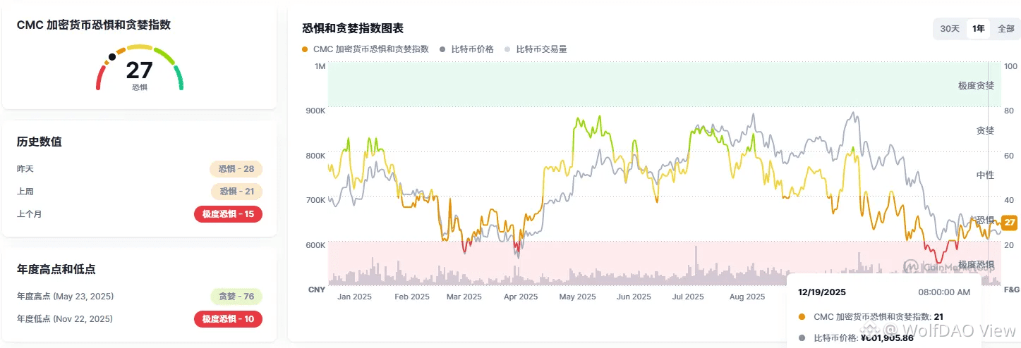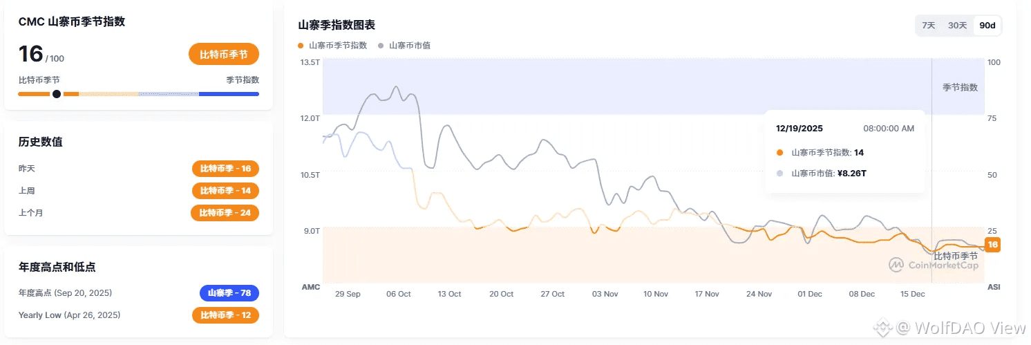 本周五山寨指数为 16,大山寨币维持低位震荡,市场交易活跃度低迷。市场情绪指数回升至 27,较上周有所改善,个别山寨币表现活跃,但整体热度不足。