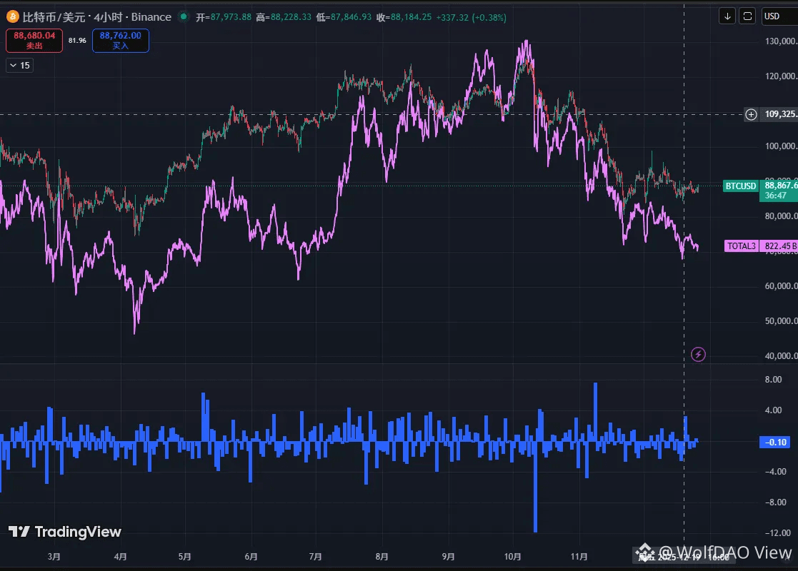 本周五 TOTAL3(剔除 BTC、ETH 后的全代币市值)达 8223 亿美元,环比上涨 1.95%。本周 BTC 在 88000 美元区间窄幅震荡,波动率处于低位。尽管美股与 A 股持续反弹,但 BTC 未跟随联动,商品市场表现强势。从资金流向来看,BTC 在传统金融配置体系中仍处于后排,在缺乏明显增量资金的情况下,大概率维持区间震荡。
