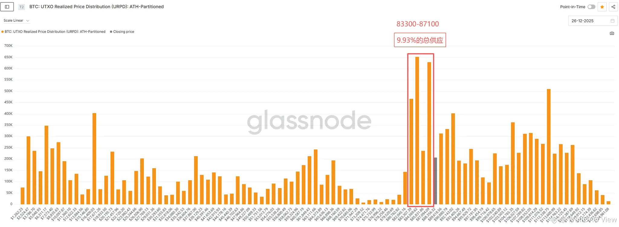 BTC 筹码结构方面,83300-87100 美元价格区间的筹码积累量从总供应的 9.03% 升至 9.93%,增加 0.9 个百分点。其中 87100 美元附近筹码积累量达总供应的 3.15%,相较于上周出现明显换手,多空博弈激烈,该价位后续有望形成强支撑。