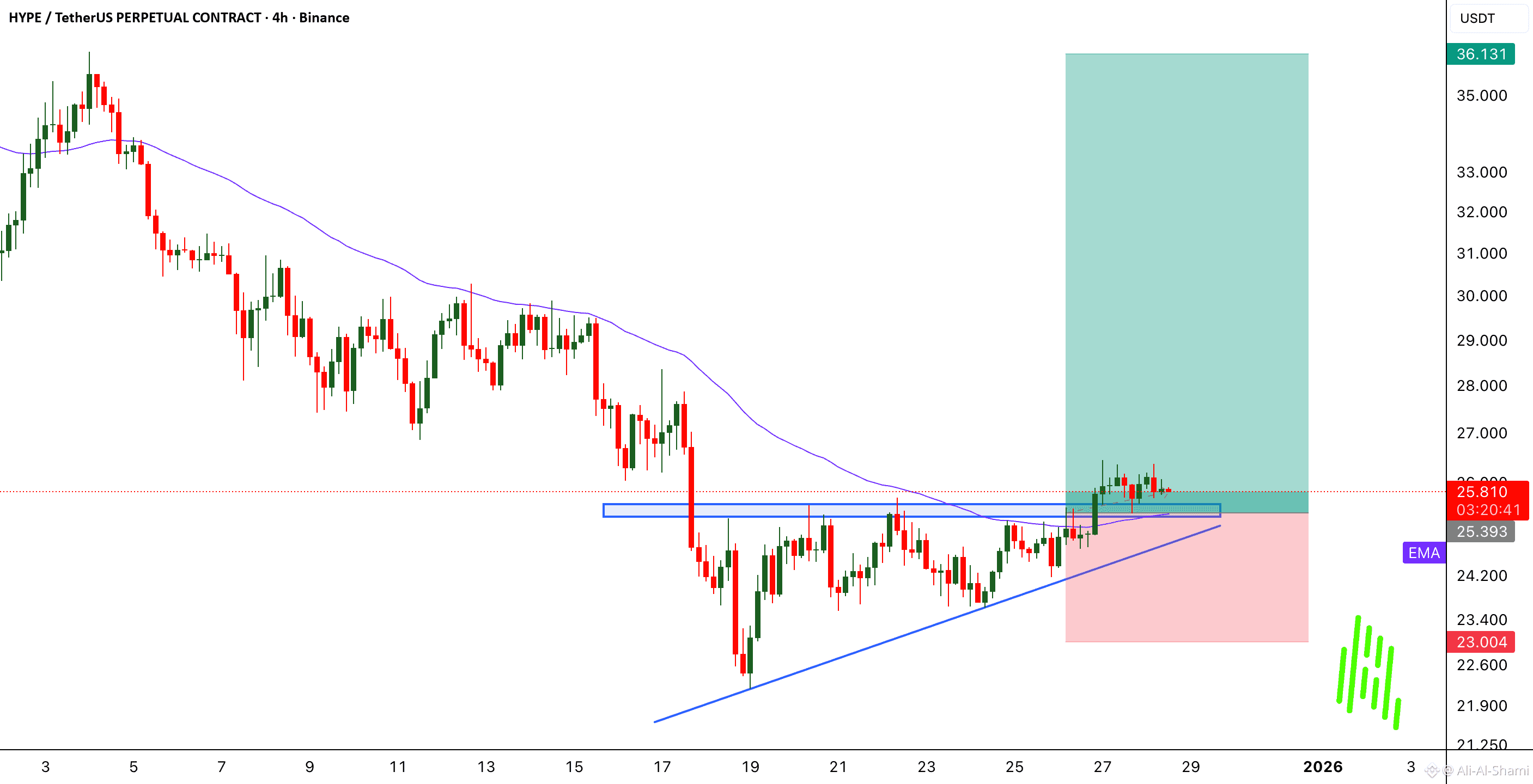 HYPEUSDT قد خرجت مؤخرًا من نمط مثلث صاعد على إطار زمني مدته 4 ساعات، مما يشير إلى احتمال تحول نحو استمرار صعودي. يعكس هذا النمط انخفاضات أعلى مستمرة مع مقاومة أفقية قوية، ويقترح الاختراق أن المشترين هم الآن في السيطرة.