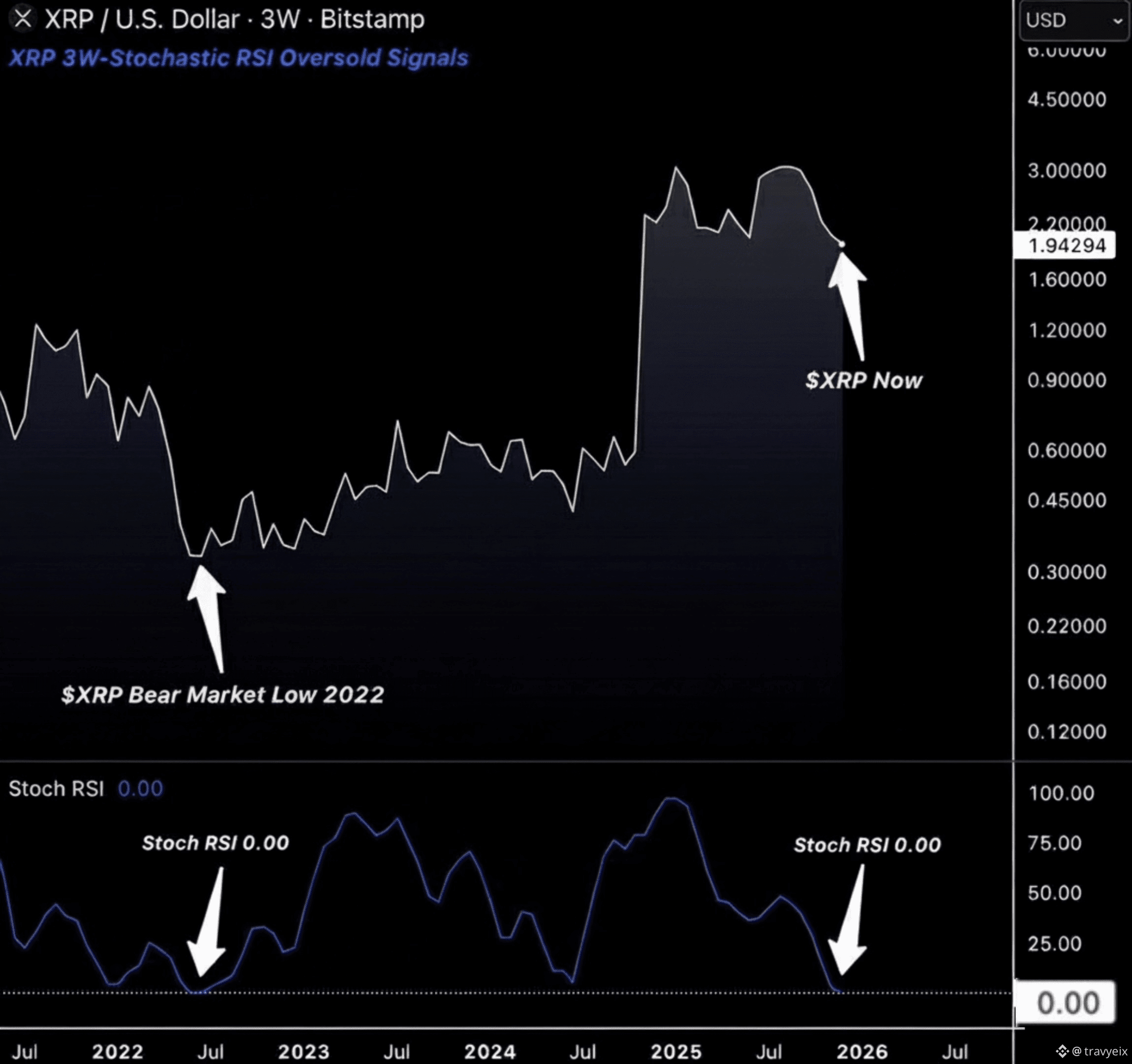 انخفض مؤشر ستوكاستيك RSI إلى الصفر المُطلق على الإطار الزمني لثلاثة أسابيع لعملة $XRP