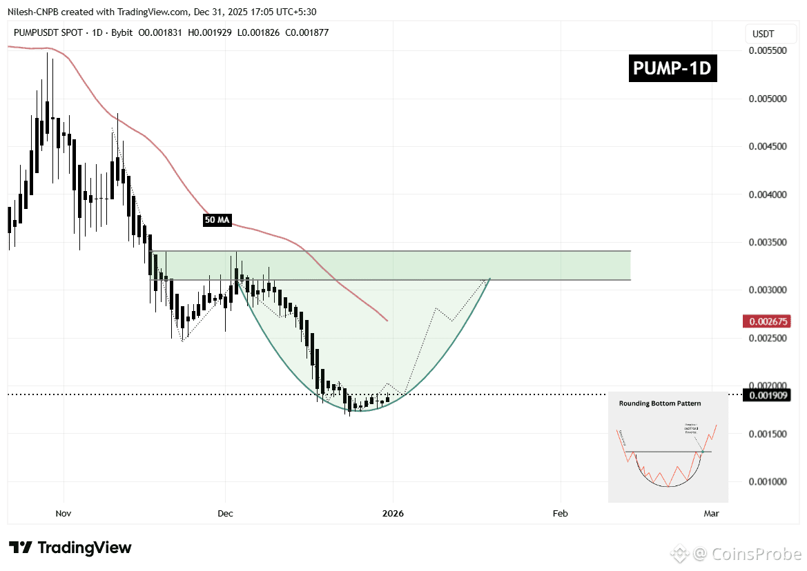 For the rounding bottom structure to gain confirmation, PUMP needs to reclaim the 50-day moving average, currently hovering near the $0.002675 mark. A sustained move above this level would signal a shift in short-term momentum and reinforce the view that buyers are beginning to regain control after months of corrective price action.