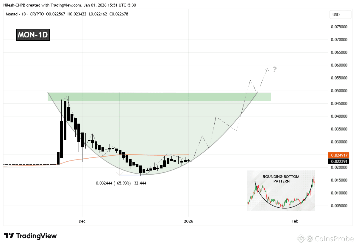 For the rounding bottom pattern to move into confirmation, MON needs to reclaim the 50-day moving average, currently positioned near the $0.02491 level. A sustained move above this area would signal a shift in short-term momentum and confirm that buyers are beginning to regain control after months of corrective price action.