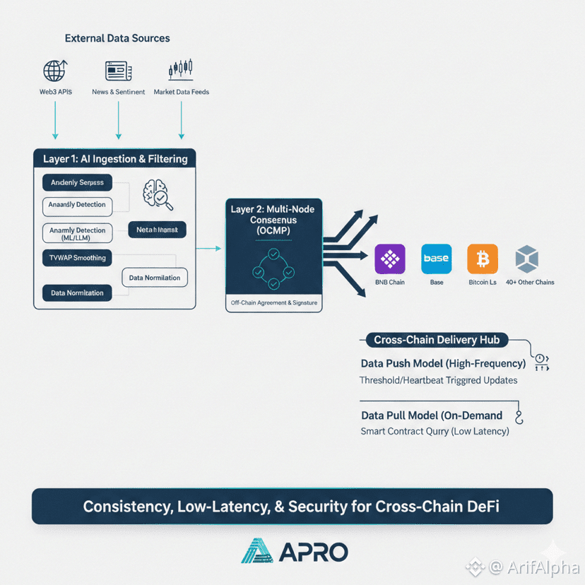 To understand how APRO maintains consistency across 40+ chains, imagine this flow: