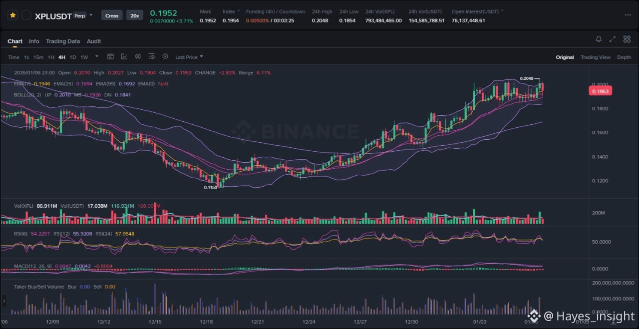 The attached chart for XPL/USDT on a 4-hour timeframe illustrates a clear breakout attempt from a multi-week downtrend, transitioning into an emerging uptrend structure. Price has formed an impulsive move upward, breaking above the 7-period EMA at around $0.165, which now acts as dynamic support alongside the 25-period EMA sloping positively for the first time in weeks. The 99-period EMA remains below the current price at approximately $0.155, confirming the shift from a prolonged downtrend to a potential range-bound consolidation with bullish bias. Bollinger Bands have expanded notably, with the middle band (20-period SMA) at $0.168 serving as a pivot; the upper band rejection at $0.172 earlier in the session hints at volatility expansion without immediate overextension.
