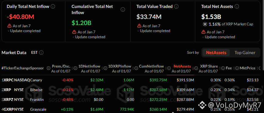 🔸 7 січня US Spot XRP ETFs зафіксували загальний чистий відток у розмірі $40,8 мільйона, зокрема 21Shares TOXR фунд очолив вихід, вивівши $47,25 мільйона.