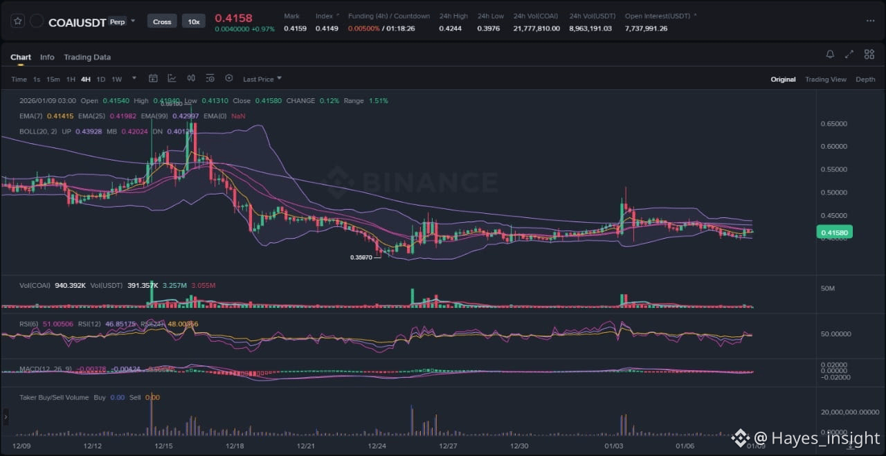 The broader crypto market remains in a choppy consolidation phase, with Bitcoin hovering around key support levels and altcoins like COAI experiencing amplified volatility due to their smaller market caps and project-specific narratives. COAI, tied to ChainOpera AI's ambitions in decentralized AI infrastructure, has seen its price action dominated by sharp corrections following hype-driven pumps. From the attached chart, which captures the 4-hour timeframe, COAI's price sits at approximately $4.19, reflecting a downtrend that erased much of October's gains. The token's journey from a high near $25 earlier in the month to this sub-$5 territory underscores a classic distribution phase, where early buyers faced liquidation cascades. Trading volume has contracted significantly, dropping to levels around 20% of peak activity, which often precedes either capitulation or a liquidity-driven rebound. In the context of the overall market, COAI's performance mirrors other AI-themed tokens under pressure from macroeconomic headwinds like rising interest rate expectations and regulatory scrutiny on speculative assets. Yet, the chart hints at potential stabilization, with the price probing lower Bollinger Band boundaries, suggesting oversold conditions that could attract value hunters if sentiment shifts.