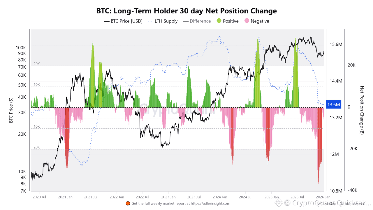 Recent on-chain data points to a clear change in Bitcoin supply dynamics as long-term holders (LTH) have moved into sustained distribution. The 30-day net position change has turned deeply negative, a pattern historically associated with late-stage trends where older coins re-enter circulation amid elevated prices. This suggests that selling pressure is no longer limited to short-term traders, but is increasingly coming from conviction holders, altering the structural balance of supply.