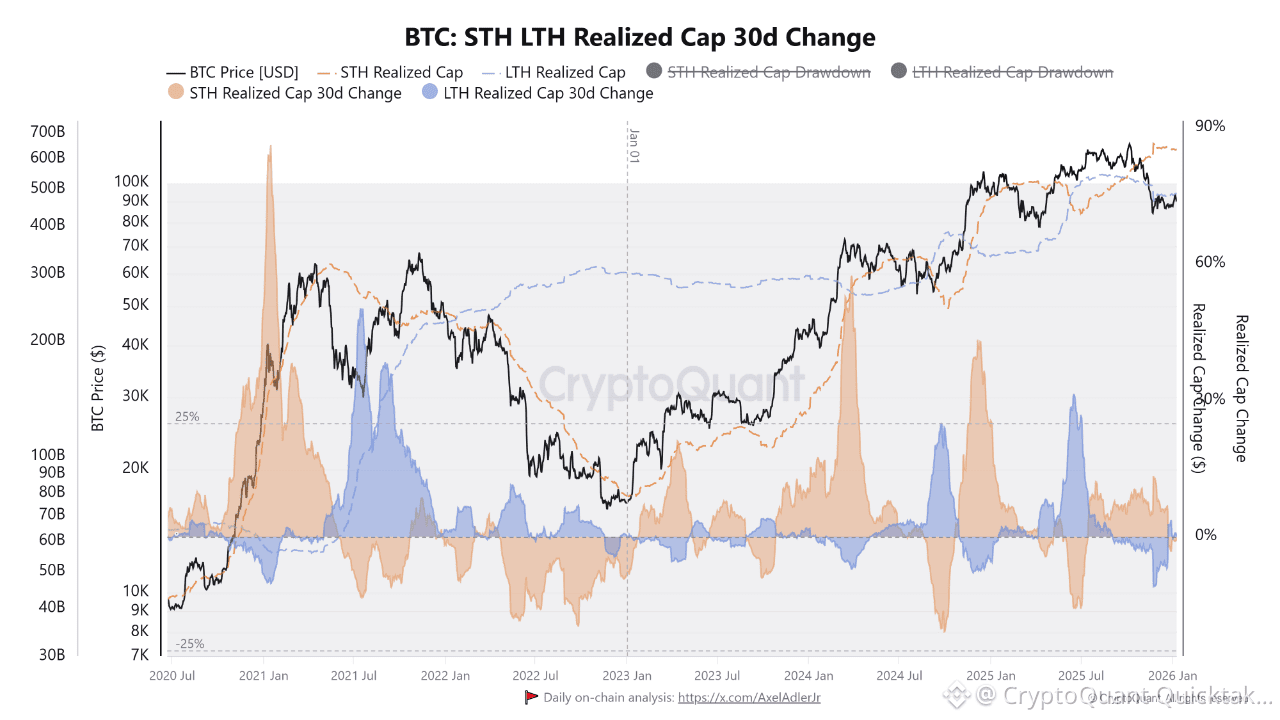 This shift is further reflected in realized cap dynamics. Slowing growth in LTH realized cap, combined with intermittent spikes from short-term holders, signals a gradual rotation of capital from long-term positioning toward more reactive participation. Such transitions typically mark a maturing trend phase, where price becomes increasingly sensitive to liquidity conditions and macro catalysts.
